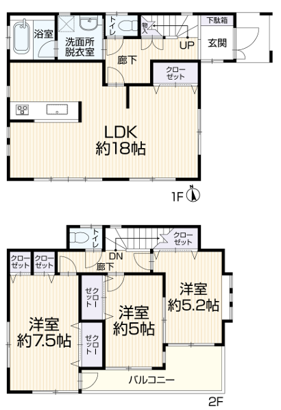 | 間取内容 | LDK18.0畳 1階 洋室7.5畳 2階 洋室5.2畳 2階 洋室5.0畳 2階 |