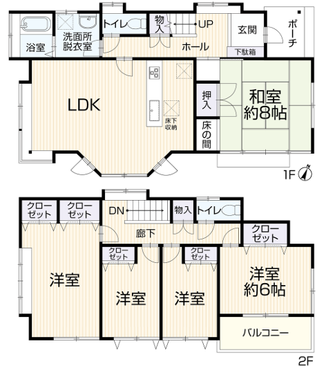 間取内容 LDK1階   和室8畳 1階   洋室6畳 2階   洋室2階   洋室2階   洋室2階