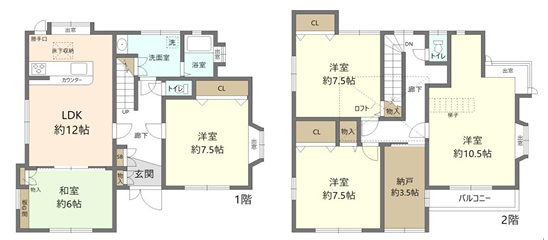 | 間取内容 | LDK12.0畳 1階 和室6.0畳 1階 洋室7.5畳 1階 洋室10.5畳 2階 洋室7.5畳 2階 洋室7.5畳 2階 |